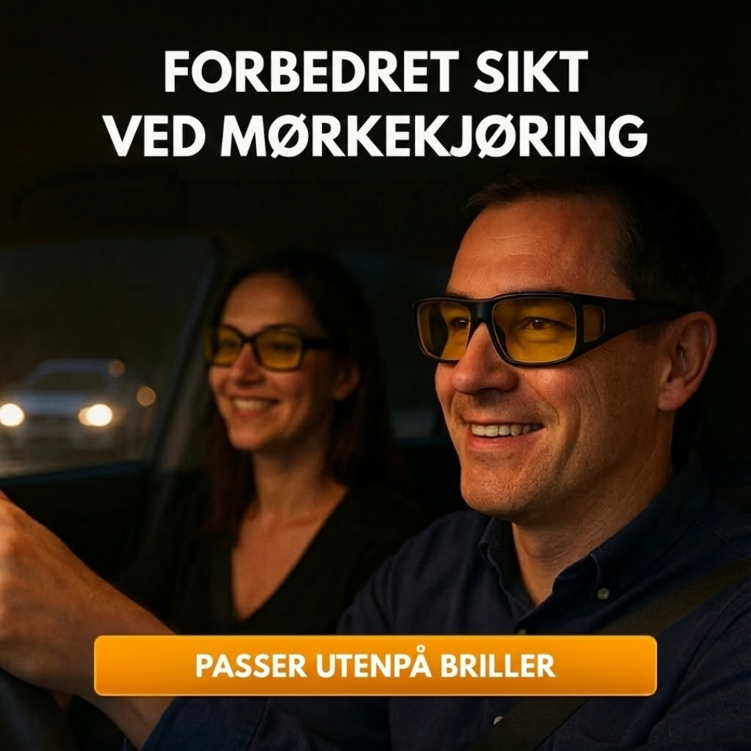 Jeg fortalte øyelegen min at jeg ble blenda så lett på mørk vei og han sa at slike briller er verdt å prøve. Jeg søkte på nettet og fant nettsiden deres. Jeg har brukt dem i tre uker nå og er veldig fornøyd! Det eneste lille minuset er at de kan dugge litt noen ganger, men det er en liten ting sammenlignet med fordelene jeg får.